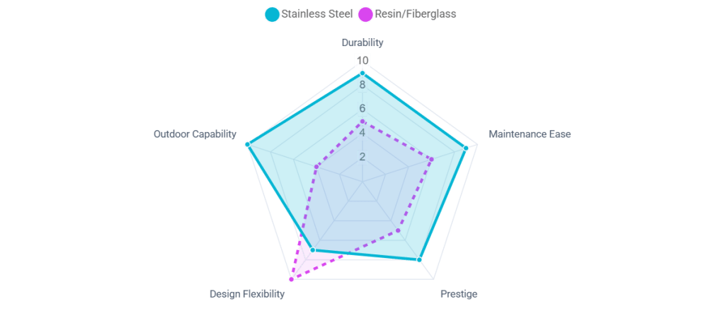 Compared to resin, fiberglass, or traditional wood, stainless steel offers overwhelming advantages in commercial settings. Its 100% recyclability aligns perfectly with global ESG (Environmental, Social, and Governance) procurement standards.